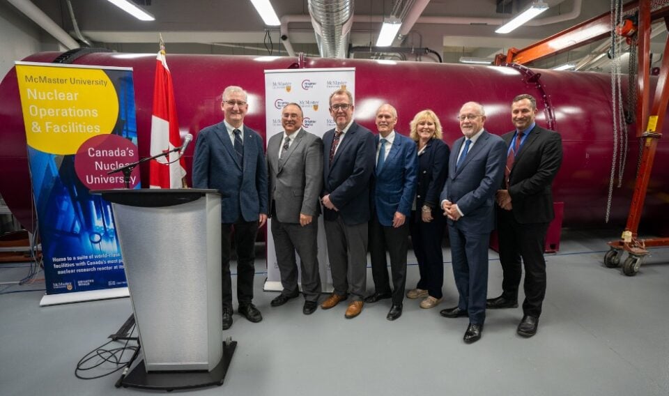 The Canadian Neutron Beam Laboratory at McMaster will enable scientists from Canada and around the world to advance critical research in clean energy, clean transportation, advanced manufacturing, medicine and more. (From left to right) Bruce Gaulin, McMaster Distinguished University Professor; Sylvain Charbonneau, president and CEO of the CFI; Andy Knights, vice-president, research (acting); David Farrar, president of McMaster; Susan Tighe, provost and vice-president (Academic); John Barrett, chair of the board of Neutrons Canada and Dave Tucker, assistant vice-president research (Nuclear).
